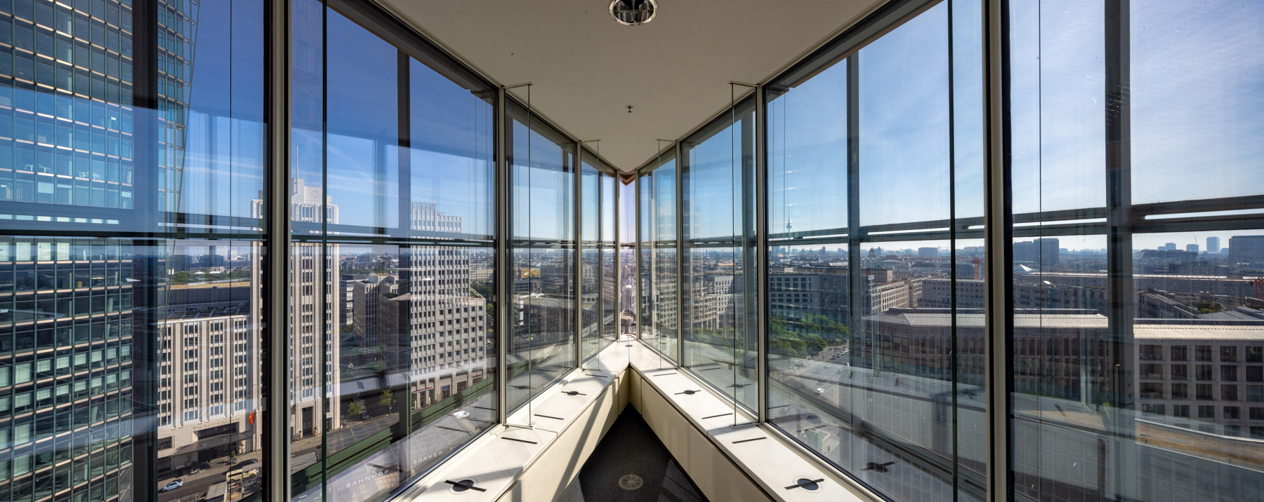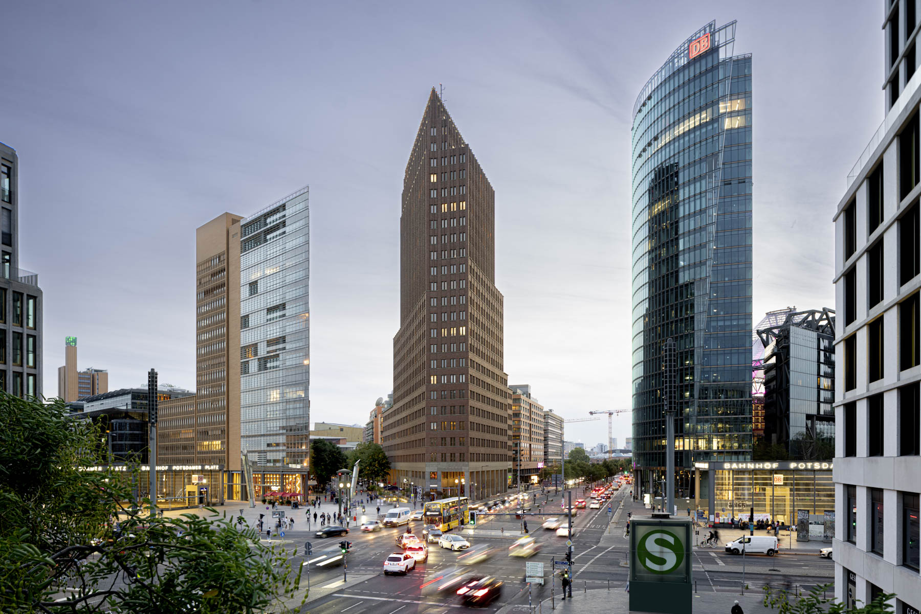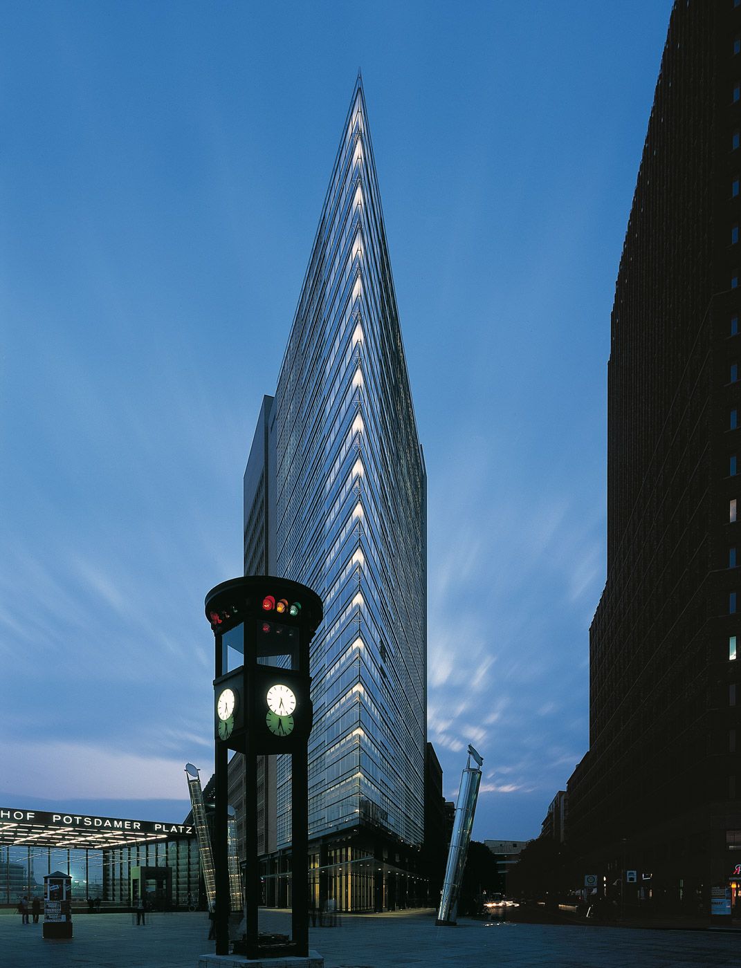 Das Gebäude B1 von Renzo Piano mit der Adresse Potsdamer Platz 11, ist durch eine Idee von Mies van der Rohe für ein Hochhaus in Berlin aus dem Jahr 1921 inspiriert. Die gläsern spiegelnde Spitze zieht die Aufmerksamkeit auf sich, sie sieht auf den Fotos aber nie so aus wie in Wirklichkeit. Beim Blick vom Leipziger Platz zeigt der Turm nur eine Seite und nimmt die viel gewichtigeren Proportionen seiner Nachbargebäude auf. Dabei die Spitzwinkligkeit eigentlich die ganze Unruhe dieses Orts repräsentiert.