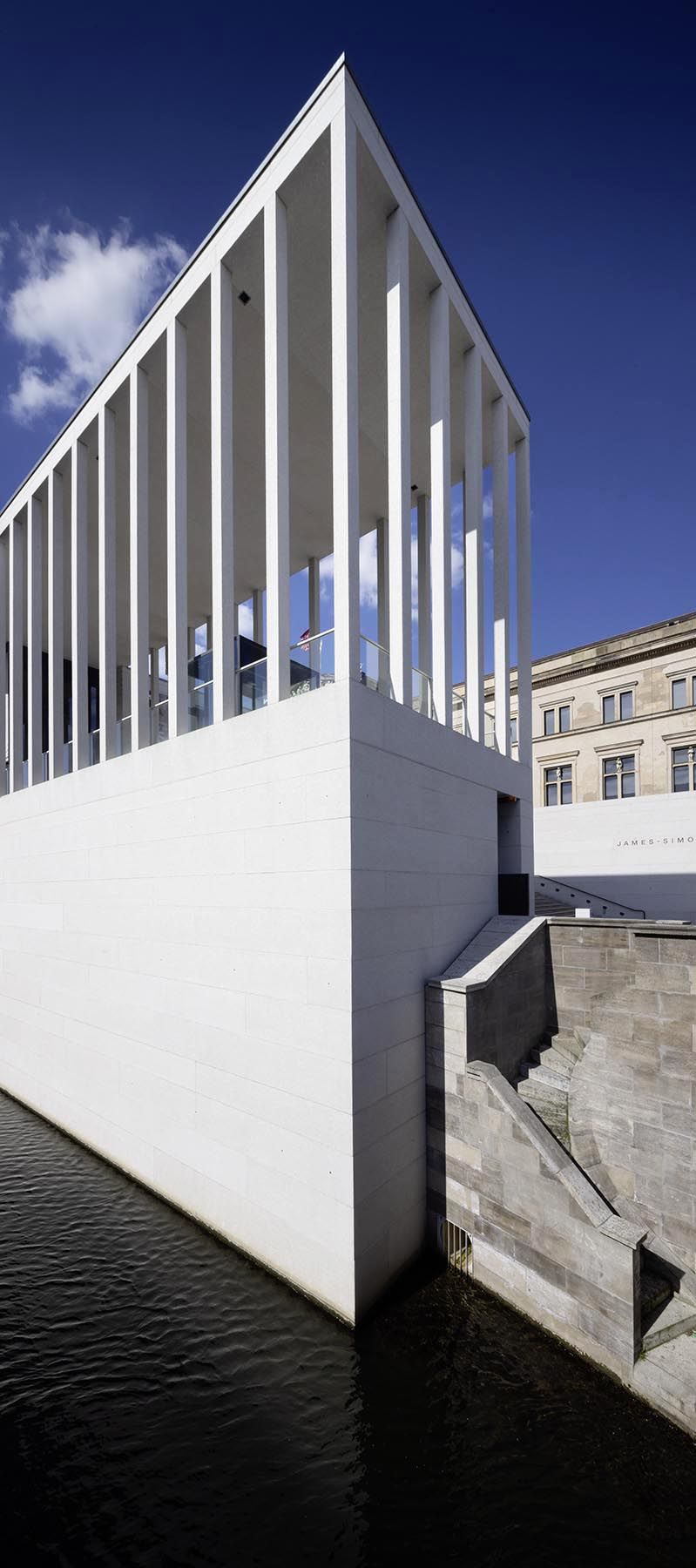 Typisch Berlin, mit Erfolg jedoch auch mit erheblichen Mitteln wurde in eins gebracht, was nicht selbstverständlich zusammengehört. Das beginnt mit der Säulenordnung, die Anleihen sowohl beim neuen Flughafen BER wie bei der Akropolis gemacht zu haben scheint. Ebenso eigenwillig die Kombination der Funktionen – die eine Mischung aus Zentralabfertigung, Wechselausstellungsfläche und Vorlesesaal unter ein Dach bringt. Alles auf getrennten Ebenen übereinander. Was das Gebäude aber nicht hoch, sondern vor allem tief macht, sodass es weit ins Wasser und den sumpfigen Grund der Berliner Stadtmitte reicht, was eine äußerst aufwendige Gründung mit unzähligen Bohrpfählen nötig gemacht hat.