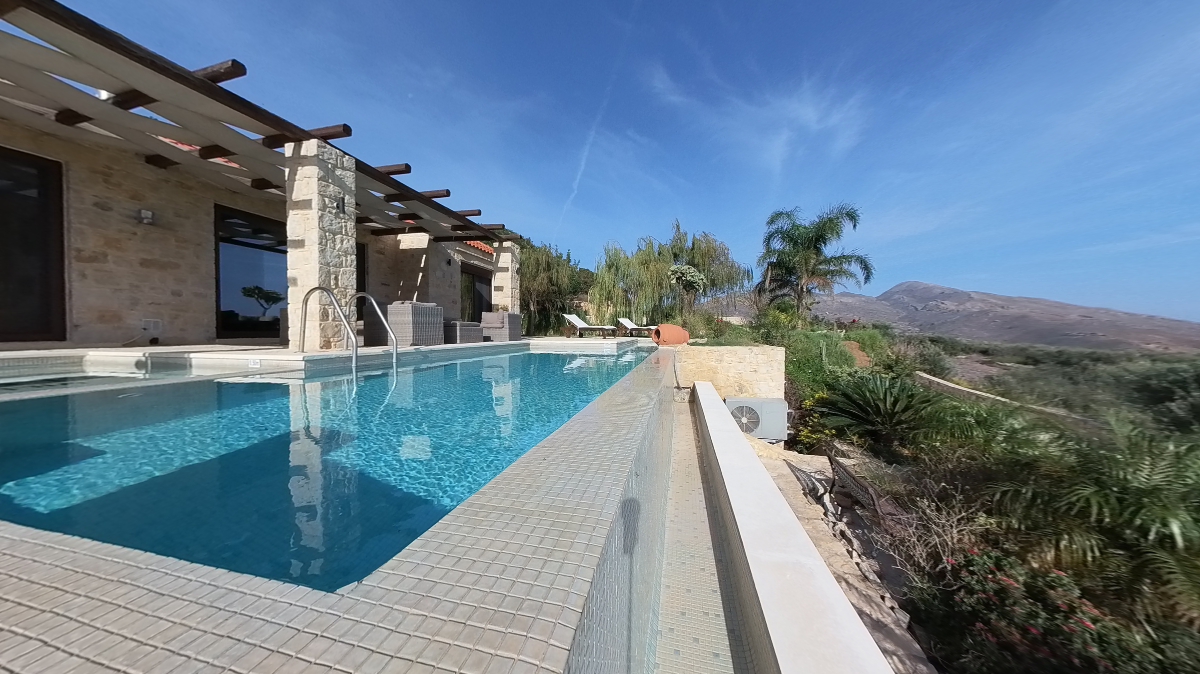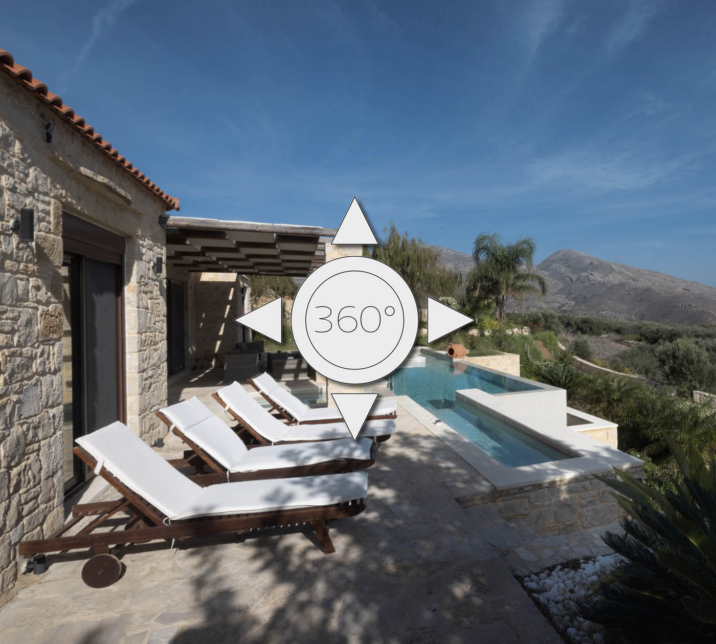 In Kreta war es nicht gelungen, den wirklich herausragenden Blick von dem frei und einzeln gelegenen Anwesen auf und über die Landschaft im Kontext mit dem Gebäude zu zeigen. Der Eigentümer entschied sich für eine 360°-Aufnahme, die ihm am besten geeignet erschien, um den Zusammenhang von Haus und Aussicht in eins zu bringen.
