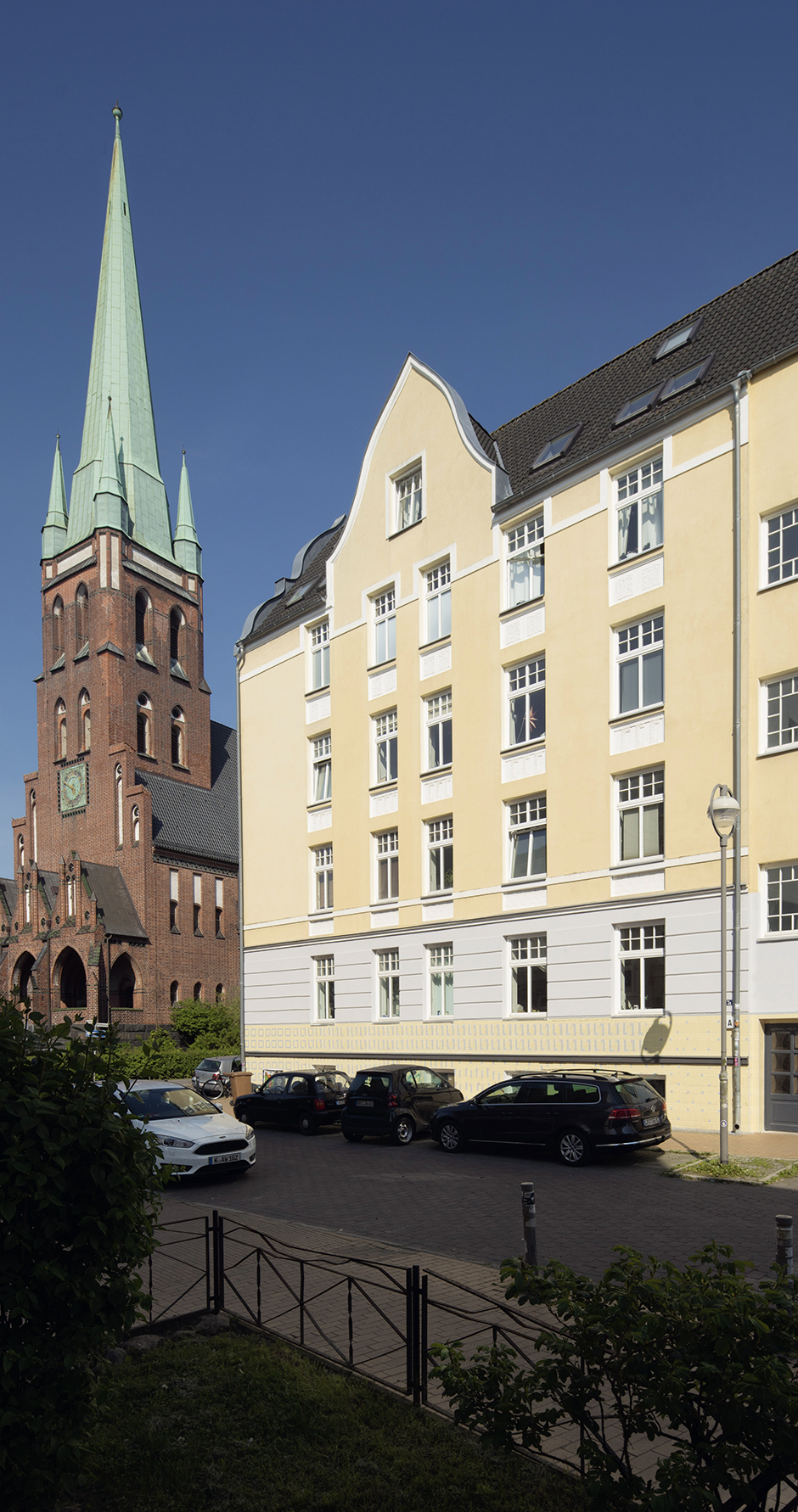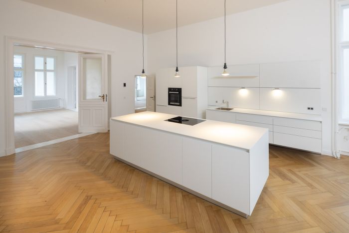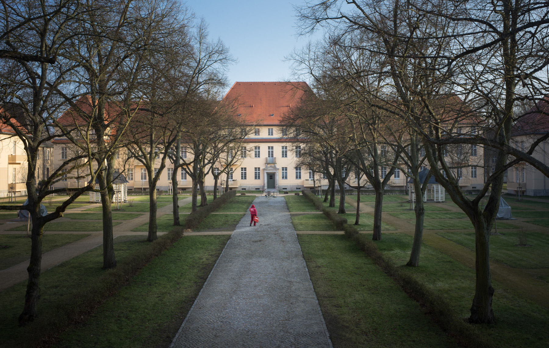 Die Aufnahmen wurden im Winter und Frühling gemacht. Der Frühling mit dem frischen Grün und blühenden Streuchern macht die Anlage sehr viel gefälliger, die bei aller Qualität der Sanierung die Strenge ihrer Architektur nicht leugnen kann. Im Winter wird allerdings deutlich, wie vorteilhaft der großzügige Zuschnitt im Hinblick auf die Lichtsituation bis in die Erdgeschosse ist. Und dass hohe Räume und große Fenster eben eine ganz eigene Qualität besitzen.
