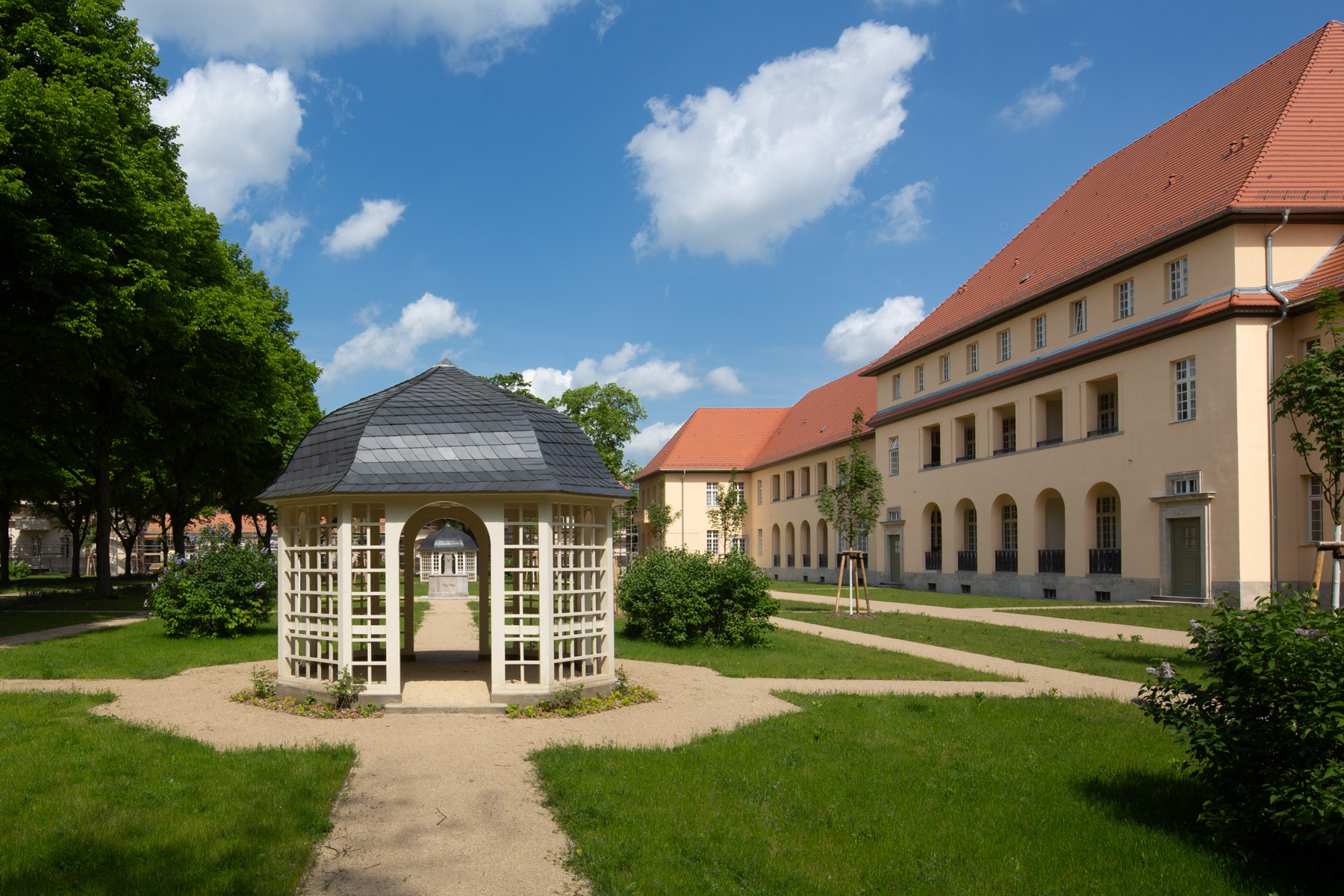 Buch ist ein Vorort im Norden von Berlin und ein traditioneller Standort der Medizin und Medizin-Wissenschaft. Hier wurde das LHQ aus einem alten Krankenhaus-Komplex entwickelt und ist heute ein Wohnviertel mit eigener Schule und Kindergarten. Neben dem Denkmalschutz geben die Großzügigkeit des Grundstücks und die wirklich parkartigen Grünanlagen dem Objekt einen sehr eigenen Charakter.